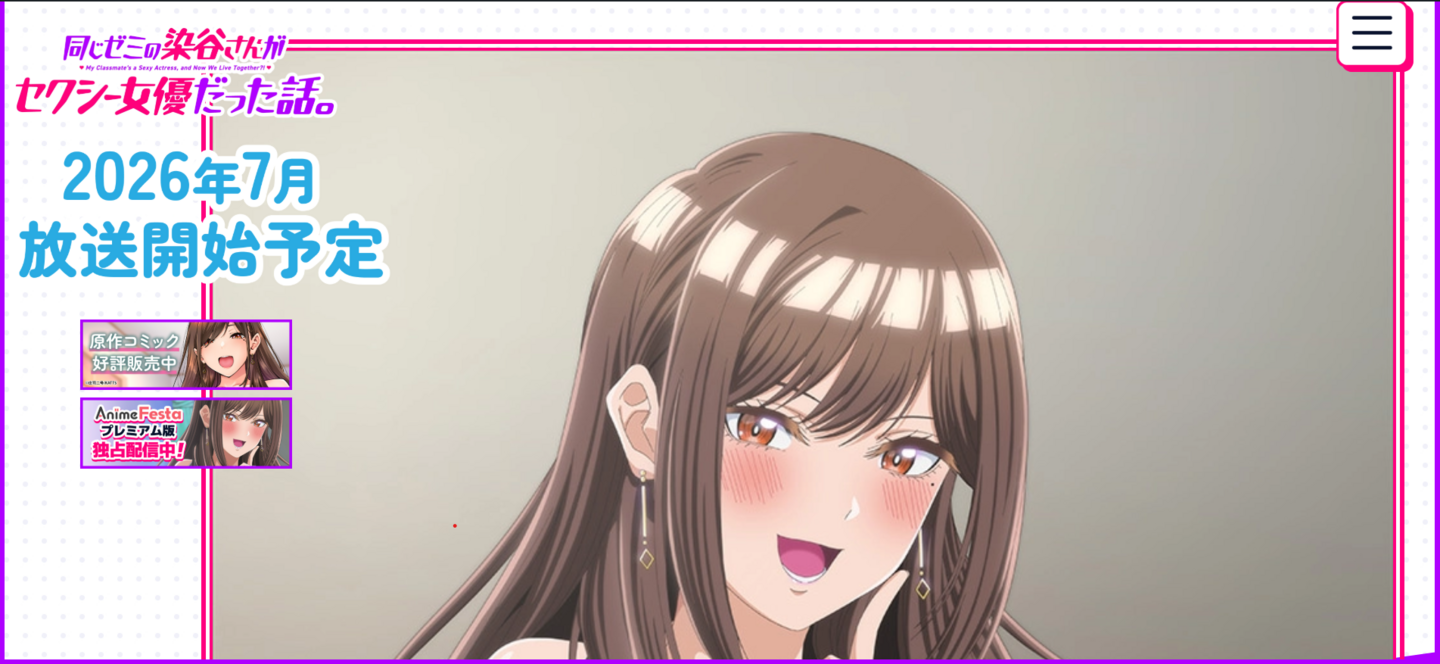 本日4月24日(金)、株式会社彗星社運営のアニメーションレーベル「AnimeFestaオリジナル」より、TVアニメ『同じゼミの染谷さんがセクシー女優だった話。』に関する新たな情報を公開いたしました。このたび、『同じゼミの染谷さんがセクシー女優だった話。(出版:KATTS/著者:庄司二号)』の放送が2026年7月より開始されることが決定いたしました。本情報とともにキービジュアル、公式HP、キャスト、キャラクターデザイン、スタッフ情報を公開いたします。さらにキャストからのコメントも到着いたしました。