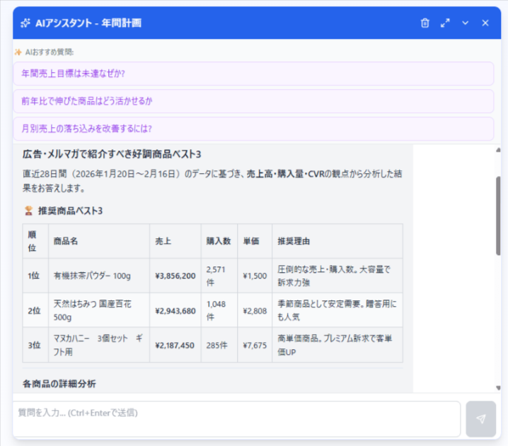 「先月と比べて売上はどう変化した?」「売上が落ちている商品とその原因は?」「このページの改善方法を教えて(URL添付)」といった自然な質問に、AIがGA4データを読み取って具体的な数字と改善施策を回答します。