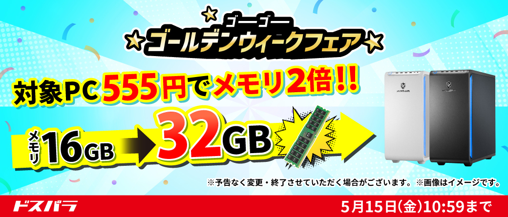 【ドスパラ】メモリ・クーラー・電源がそれぞれプラス555円でアップグレード さらにポイントプレゼントキャンペーンも同時開催 『ゴーゴーゴールデンウィークフェア』