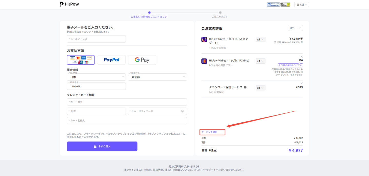 ③決済情報の入力画面にある「クーポンコード」欄にコピーしたコードを貼り付け、適用ボタンを押すことで割引価格が反映されます。