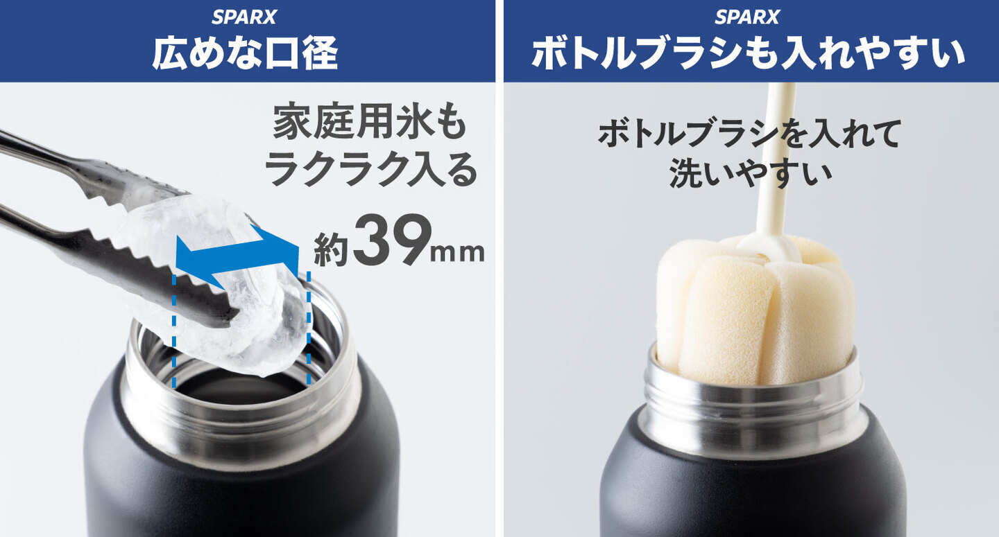 口径39mmと広めの口径で、家庭用製氷機で作った氷がそのまま入るサイズなので、氷を砕く手間がありません。市販のボトルブラシも底まで届きやすく、隅々までしっかり洗えて衛生的です。