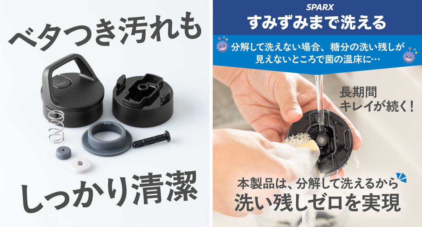 圧抜き機構は細かくパーツ分解できるので、すみずみまでしっかり洗えます。水筒の汚れで特に注意したいのが、洗えない細かいパーツに潜む菌の繁殖。糖分を含む炭酸飲料はベタつきが残りやすく、洗い残しがあると雑菌が繁殖する原因になります。本製品は細かく分解できるので、洗い残しゼロを実現し、長期間キレイが続くよう清潔さにこだわりました。