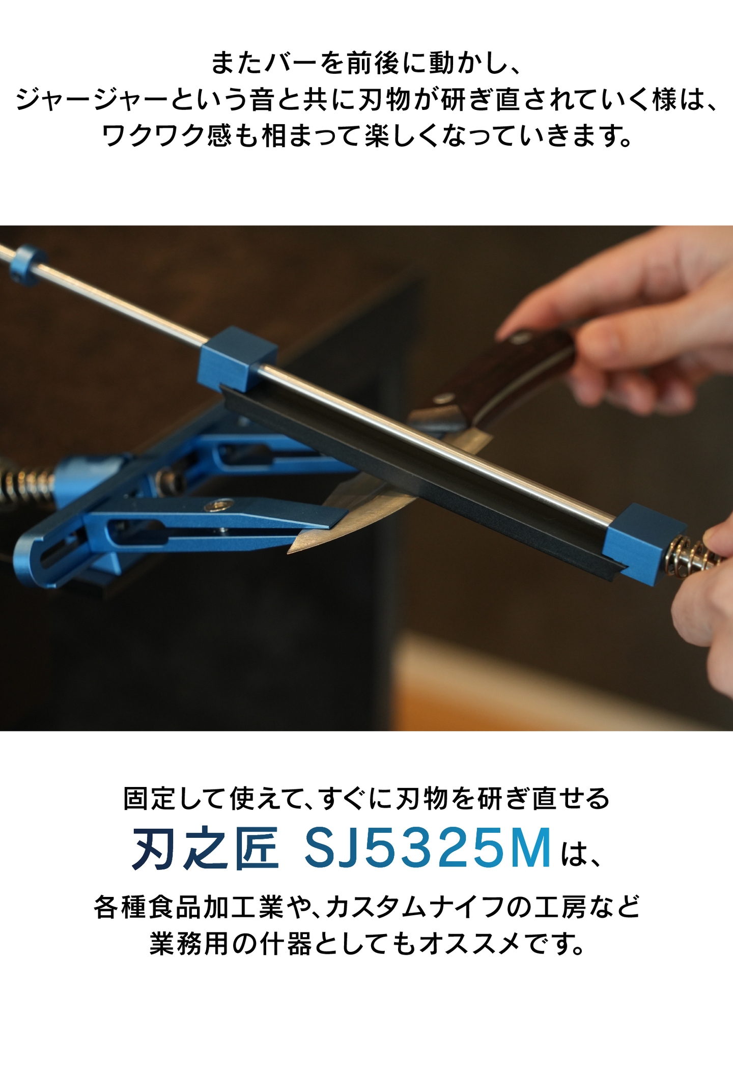 「刃之匠」は、刃物を固定台にセットし、ダイヤモンド砥石をスライドさせるだけで、素人でもプロ並みの切れ味を実現できる次世代型シャープナーです。