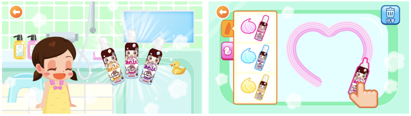 本ゲームでは、「あわっぴー」の泡で動物や乗り物の形を描いたり、カラフルなアイテムで飾りを付けたり、自由な発想でお絵描きを楽しむことができます。入浴時間を親子で楽しむポジティブな時間へと変えることで、お風呂が大好きな子どもを増やし、家族の健やかな入浴習慣を後押しします。