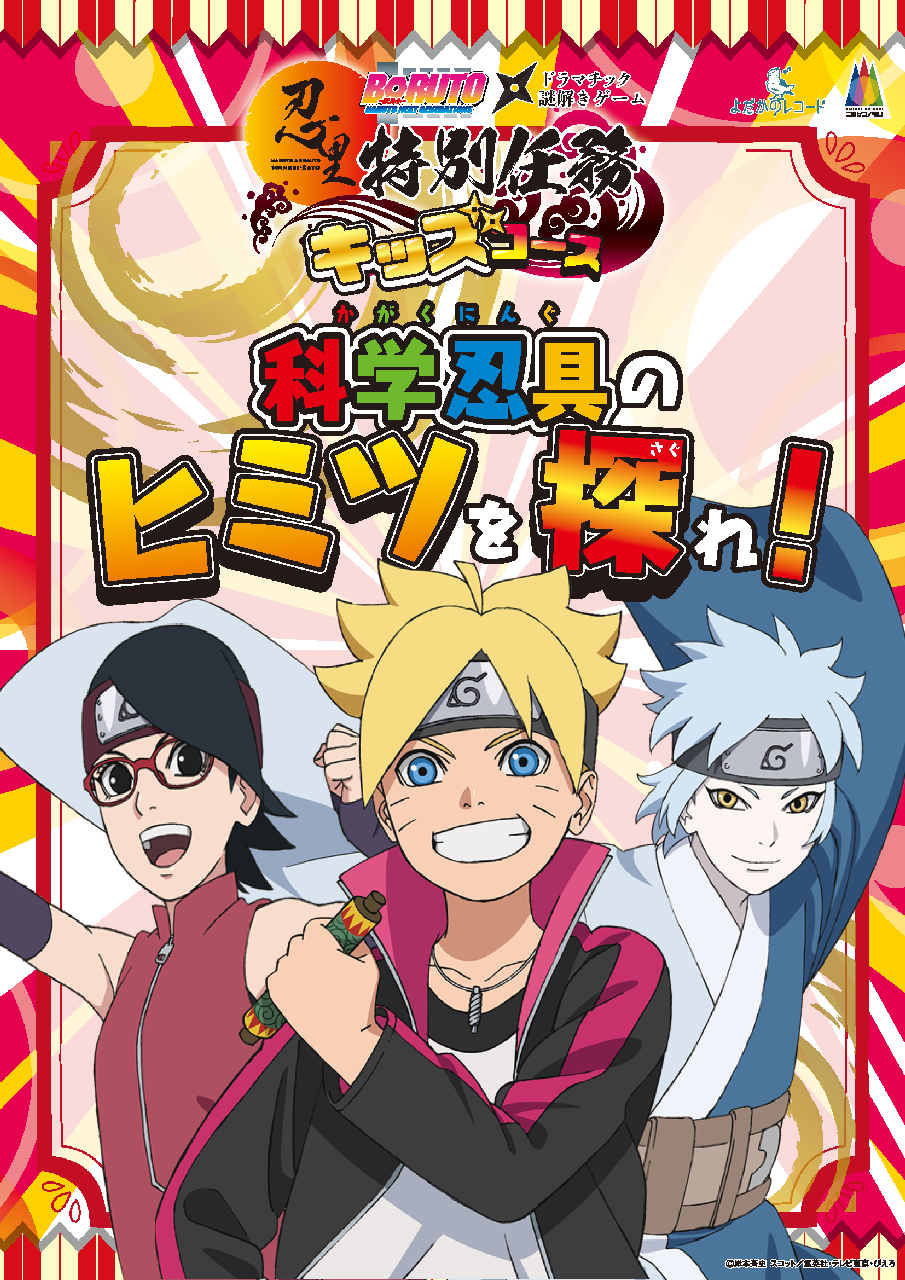 「NARUTO&BORUTO 忍里」エリアにて、ボルト・サラダ・ミツキが登場する体験型謎解きゲーム「科学忍具のヒミツを探れ!」を展開します。シールや折り紙を使った工作を通して謎を解き明かす参加型コンテンツで、クリア特典としてオリジナル缶バッジをプレゼントいたします。また、アワコス参加者限定でプレミアムアイテム「ミナトのクナイ」の特別貸し出しも実施し、本格的な忍者コスプレ撮影をお楽しみいただけます。