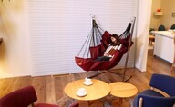 揺れ続けるハンモック形ソファ、癒しの「ワンモック」。身を任せてリラックスしたひとときをお過ごし下さい。