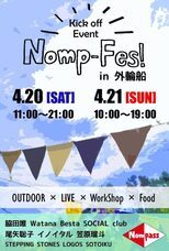 北海道の魅力をアウトドアと音楽で発信していくチームNompass(ノンパス、運営事務局:北海道東区 STEPPING STONES内、代表:脇田唯)が展開するアウトドアイベント「Nomp-Fes(ノンプ-フェス)」が4月20日(土)、4月21日(日)に北海道江別市(外輪船)で開催することが決定いたしました。またイベントの開催に伴いクラウドファンディングの実施いたします。
