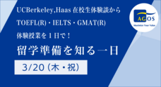 海外トップ大学・大学院留学準備指導校を運営する株式会社アゴス・ジャパン(取締役会長:横山匡、本社:東京都渋谷区)は、University of California, Berkeley Haas在校生による留学体験談とTOEFL(R)・IELTS・GMAT(R)対策の無料体験授業を1日で体験できる「留学準備を知る一日」を2025年3月20日(祝・木)に開催いたします。