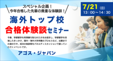 ​海外トップ大学・大学院留学準備指導校として国内屈指の合格実績・テスト対策教材開発・教授指導ノウハウを誇る株式会社アゴス・ジャパン(取締役会長:横山 匡、本社:東京都渋谷区、以下 アゴス・ジャパン)は、アゴスご受講後、今年アメリカトップリベラルアーツ・カレッジとカナダ・ブリティッシュコロンビア大学の合格を奨学金を獲得して勝ち取った先輩方をお招きし、留学準備の道のり、成功の秘訣などを語って頂く、オンラインセミナー 「【大学留学】海外トップ校合格体験談セミナー <第2弾> 」を2024年7月21日(日)に開催いたします。