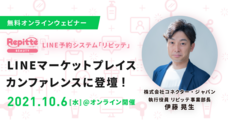 LINE公式アカウントを利用した自動注文管理ツール「リピッテ」を開発・提供する株式会社コネクター・ジャパン​​(東京オフィス:東京都千代田区、代表取締役社長:中濱康広)は、10月6日(水)にオンライン開催する「LINEマーケットプレイスカンファレンス」にて当社執行役員 リピッテ事業部長の伊藤が登壇し、「リピッテ ビューティー」を紹介します。