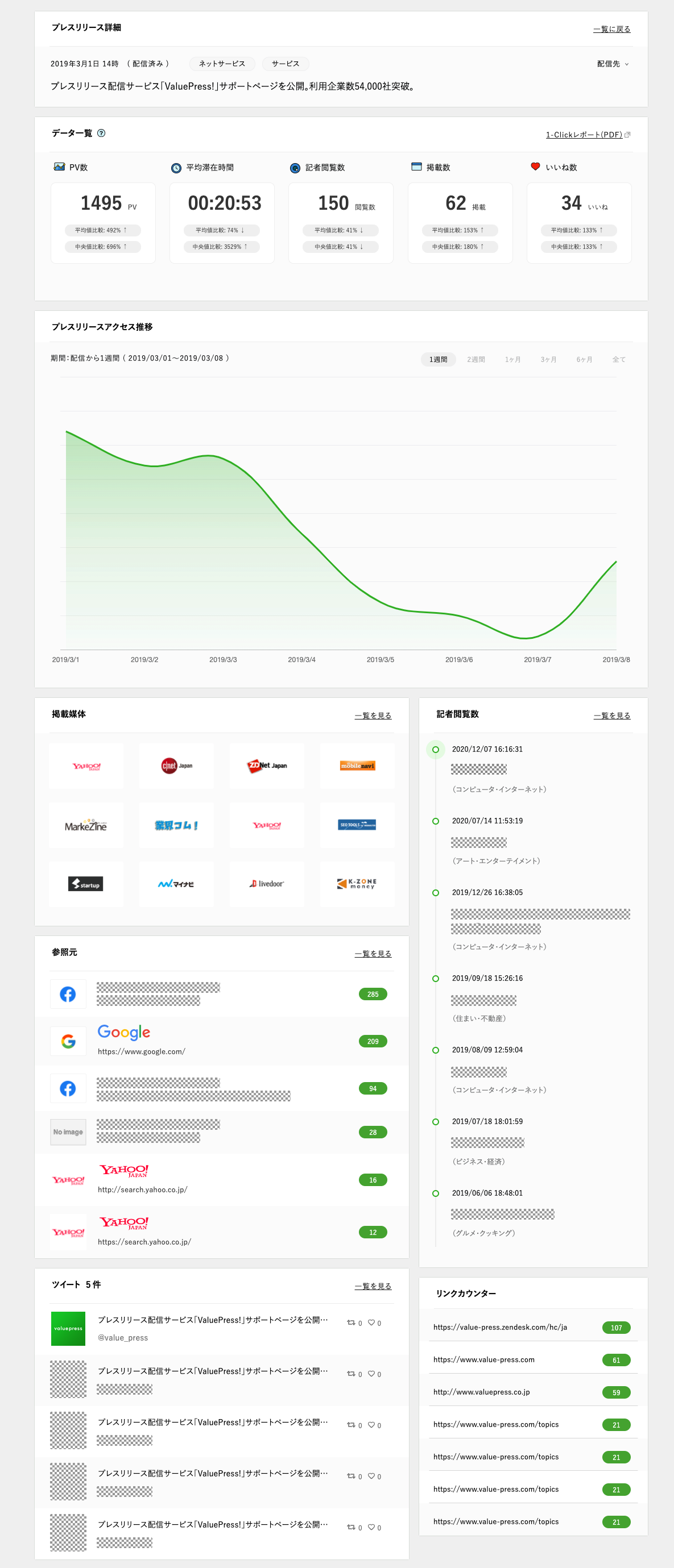 記事の掲載先・アクセス推移・SNS解析など、プレスリリース配信後の効果検証ができます。