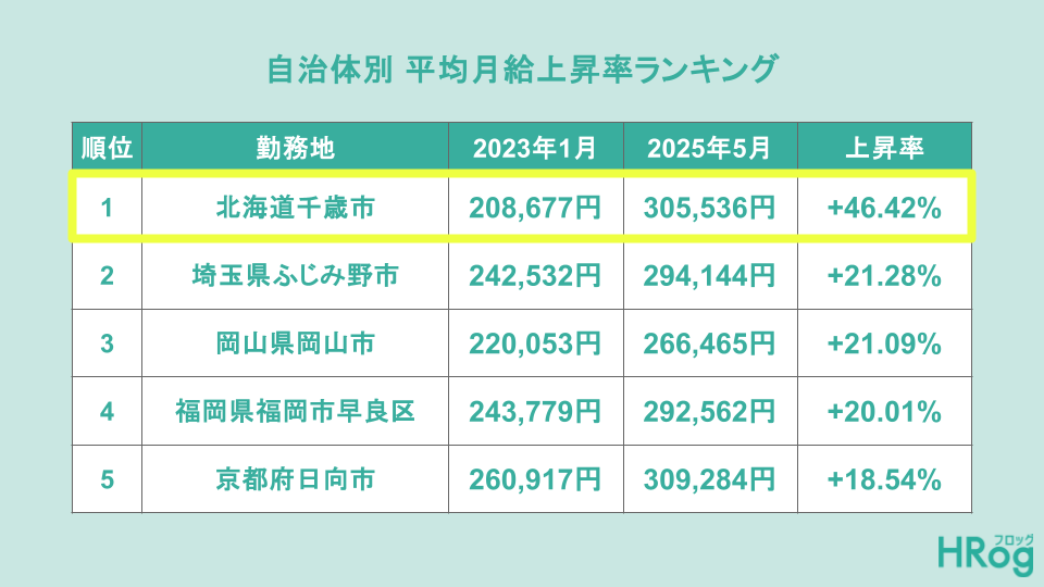 ・北海道千歳市の平均月給は、2023年1月から2025年5月にかけて46.42%で増加し、全国の自治体で1位の上昇率となった