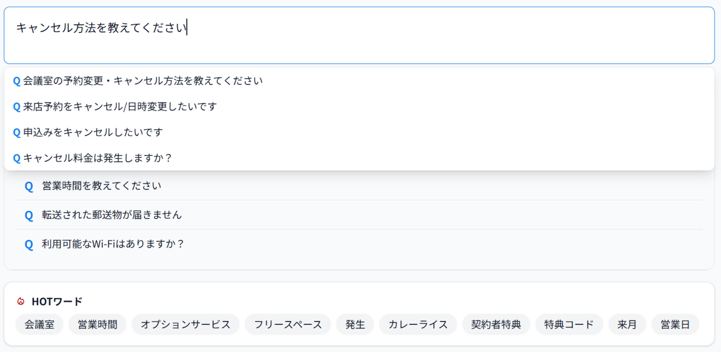 例えば「キャンセルしたいのですが」という入力に対し、「キャンセル手順を教えてください」「キャンセル料はいつからかかるか」といった関連度の高いFAQを先読みしてサジェスト表示します。